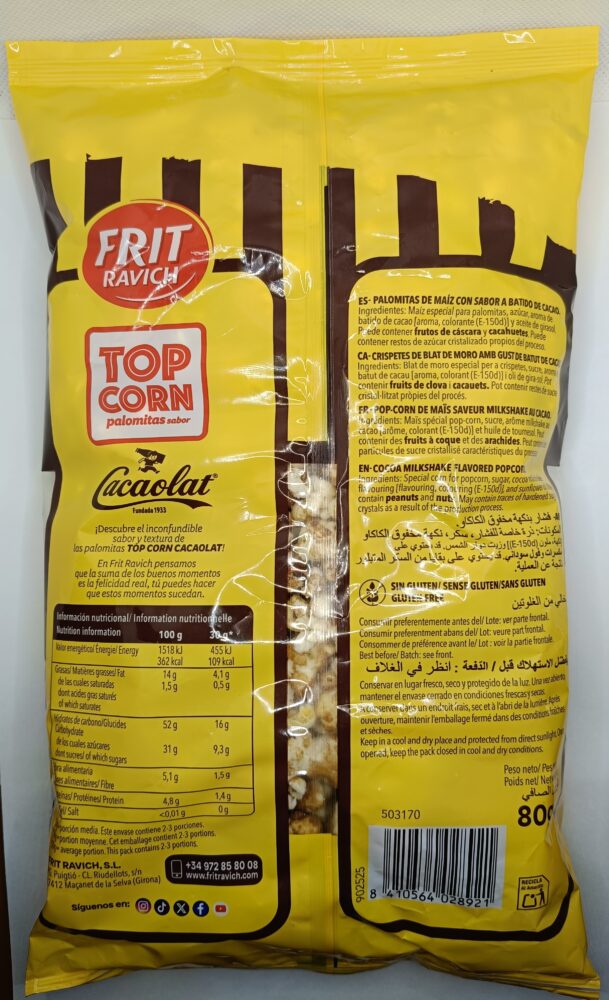 maíz especial para palomitas, azúcar, aroma de batido de cacao [aroma, colorante (E-150d)], aceite de girasol